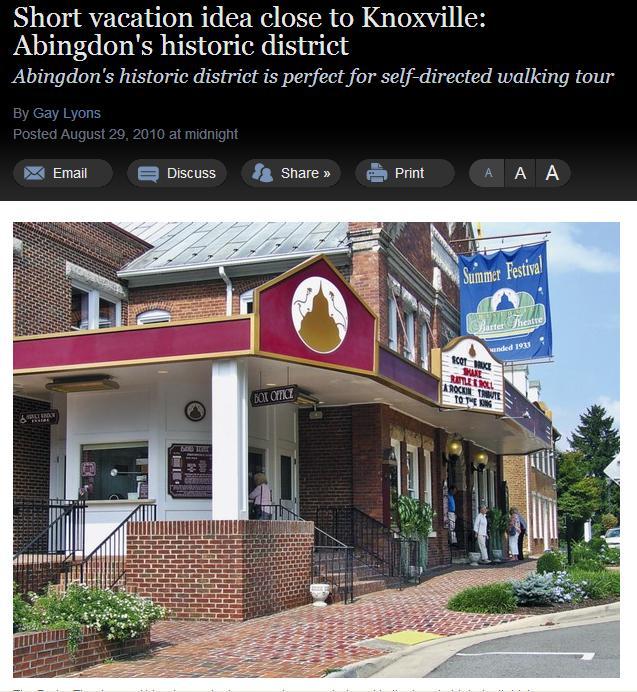 A Sunday travel piece in the Knoxville News Sentinel this weekend presented readers with all they need to know for a weekend trip to Abingdon, Virginia’s historic district. The article included an itenerary of things to see on a self-guided tour (brochure available at the visitor’s center), including a run-down of retail, restaurant, and lodging busineesses in this Virginia Main Street (VMS) Community.