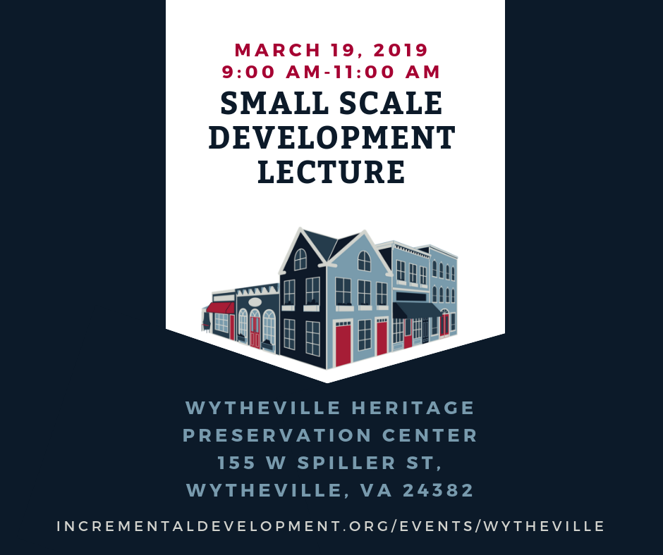 DHCD will host educational lectures by the Incremental Development Alliance around the commonwealth in March. These lectures will explain common development challenges and detail a series of finance, design and construction techniques specific for completing successful small building projects – both rehabilitation and new construction, as well as discussing the value of small buildings to the local tax base. The goal is to building interest in the upcoming workshop (Staunton – May 16 – details TBA) that takes a deeper dive into the “how” of small-scale development.