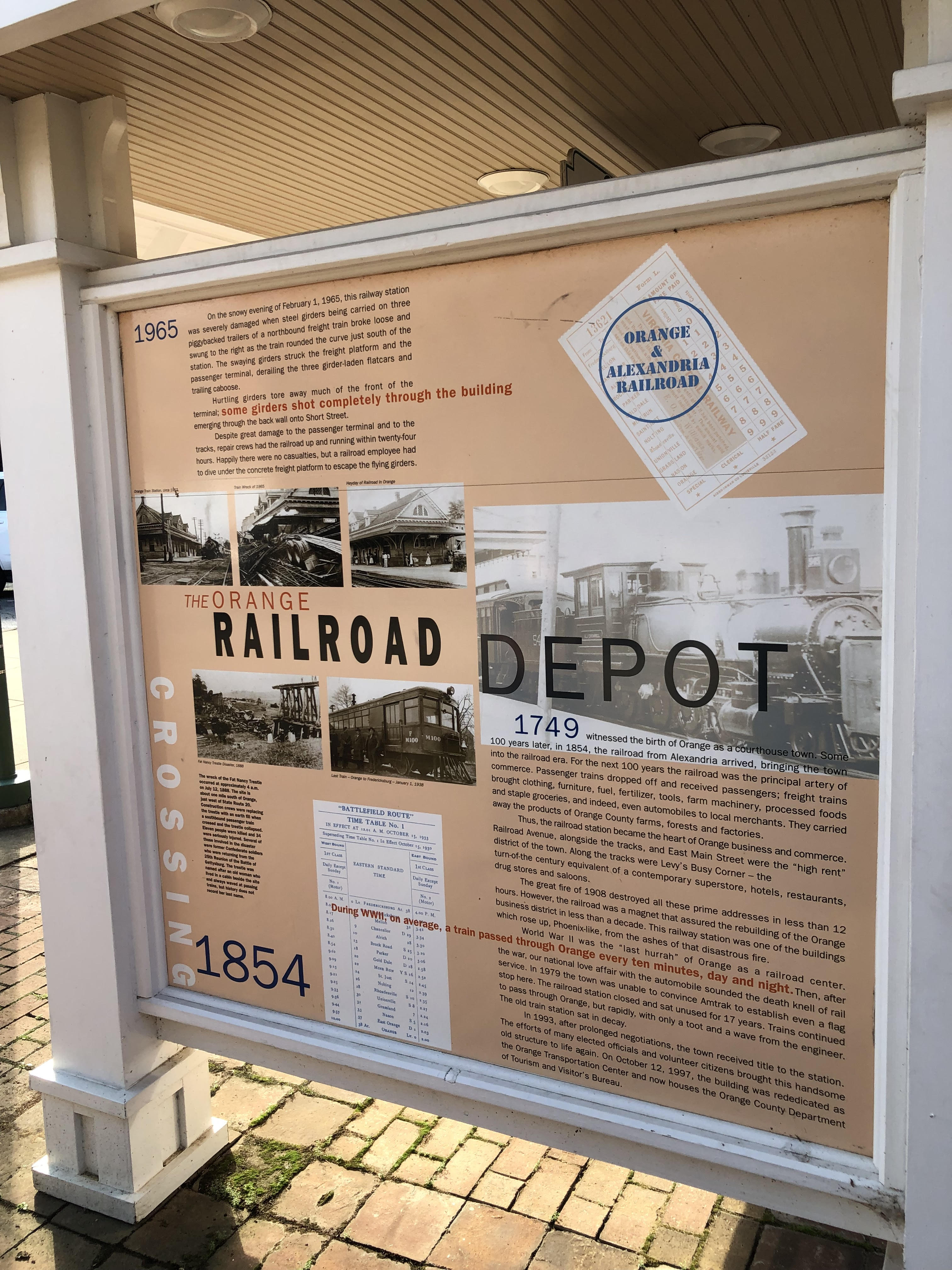 After admiring the Robertson Plaza, I couldn’t help but notice the historic Orange Train Station, built more than 100 years ago, that sat prominently on the corner of Short Street and East Main Street (beside the Robertson Plaza). While passenger train service was discontinued roughly 50 years ago, the train station was renovated in 1997, becoming the home of the Orange County Department of Tourism and Visitors Bureau, which features an awesome kiosk that offers visitors a great deal of information pertaining to the town’s history, the railroad depot and much more!