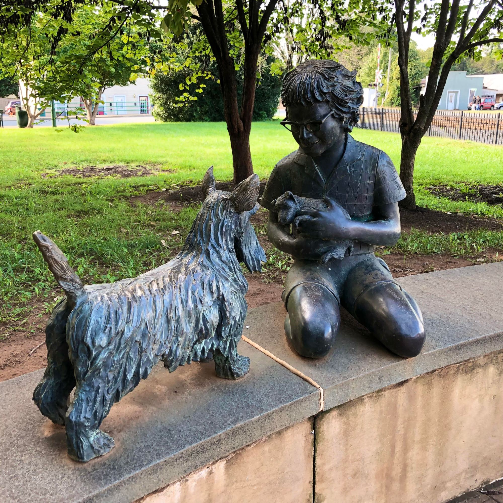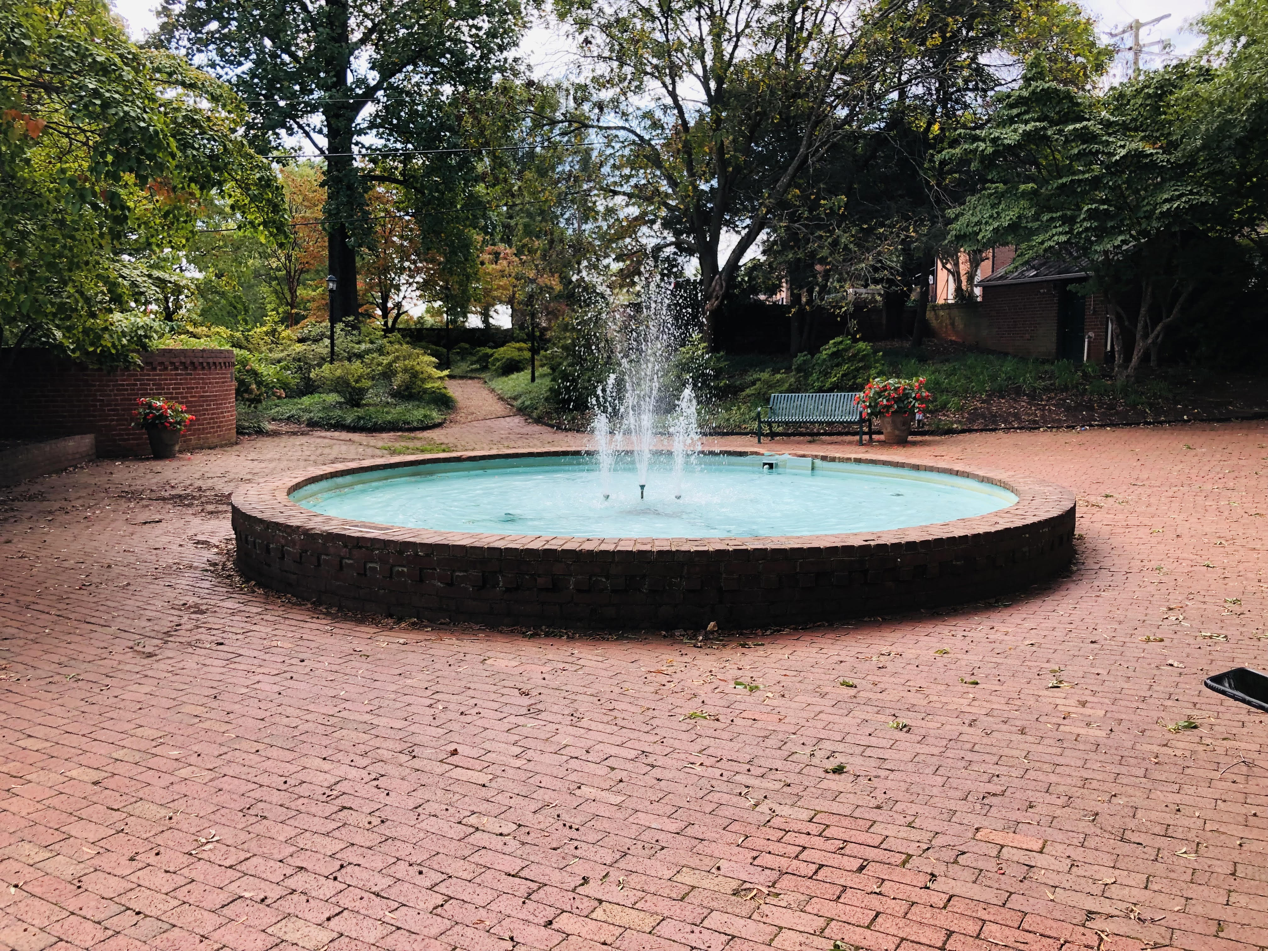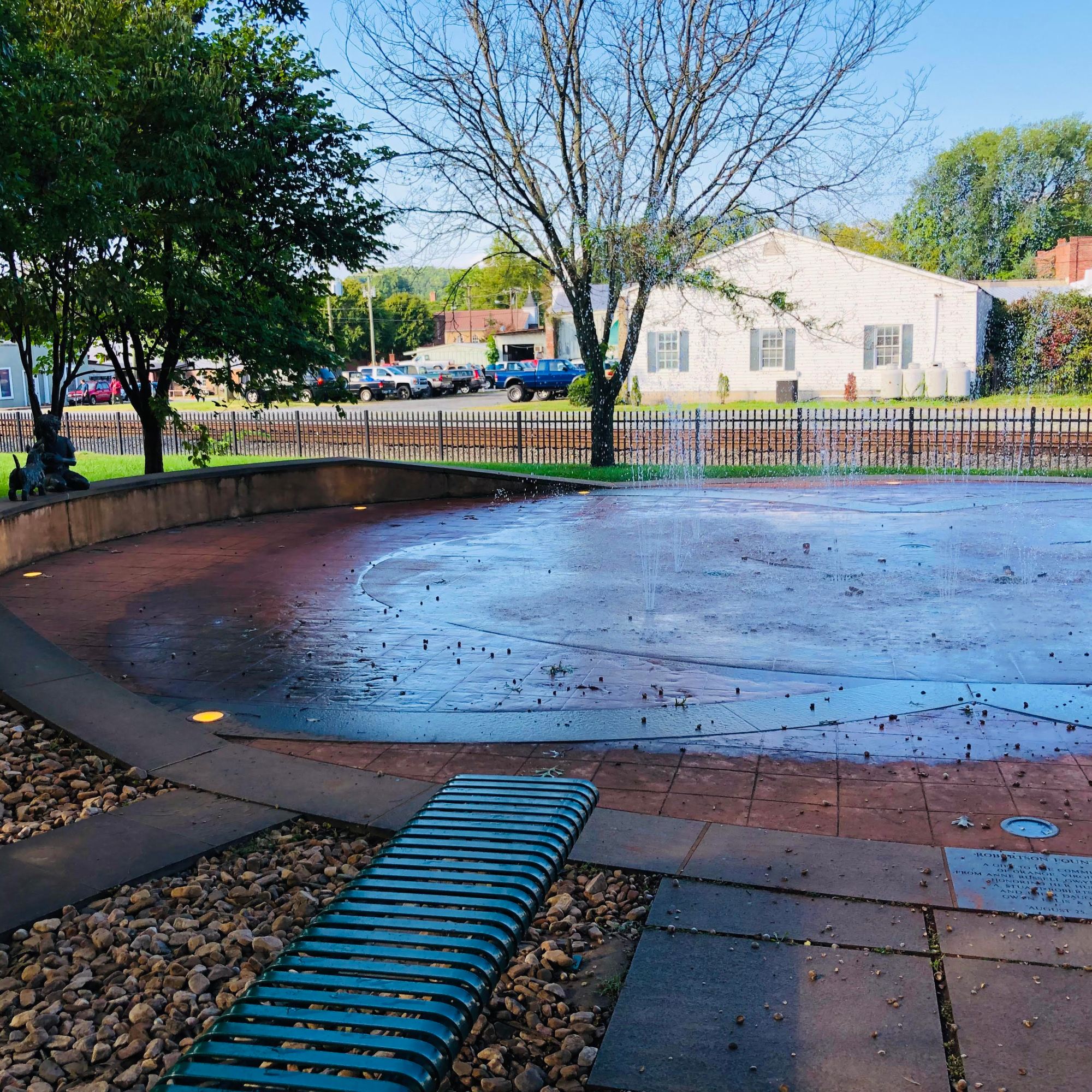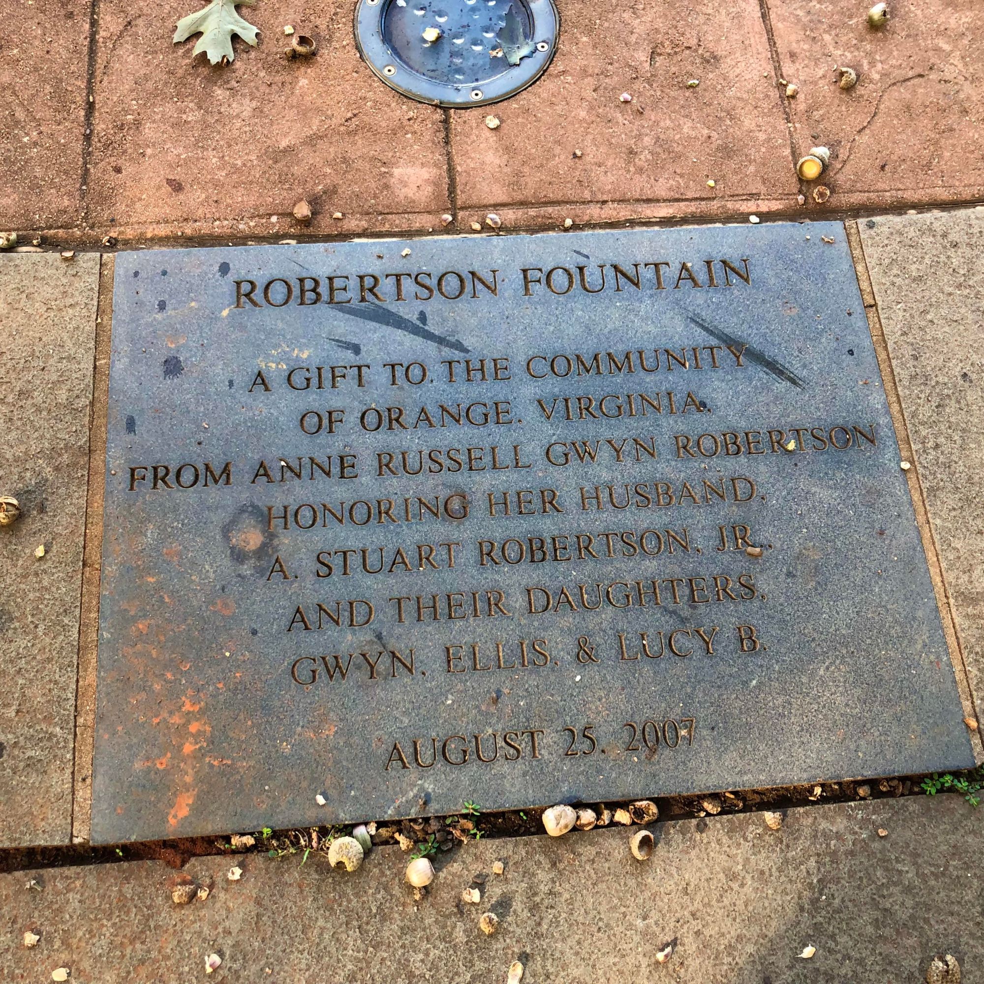 Around the corner from the soon-to-be commemorative park, Charlotte led us to the Robertson Plaza, a beautifully landscaped plaza that features a large fountain (splash pad) where children and others can play in the intermittent jets of water or simply relax while strolling through downtown Orange. In 2007, Anne Robertson, or Russ as she was more commonly known in the community, worked alongside LOVe, one of several organizations she supported, to create the plaza in memory of her late husband, A. Stuart Robertson, Jr., and their daughters, Gwyn, Ellis and Lucy B (statue). I love seeing these type of places for respite amongst the hustle and bustle of downtown in Main Street communities.