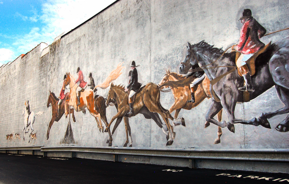 Upon arriving, I parked close to LOVe headquarters where I planned to meet Charlotte to kick off the tour of downtown Orange. After parking the car and preparing to walk over to the local Main Street program’s office, my attention was immediately drawn to an equestrian-themed mural depicting a group of horsemen, led by their master of foxhounds, actively engaged in the sport of fox hunting. Reflecting on the scene, I remembered that the county’s countryside is home to various horse farms / elegant equestrian properties.