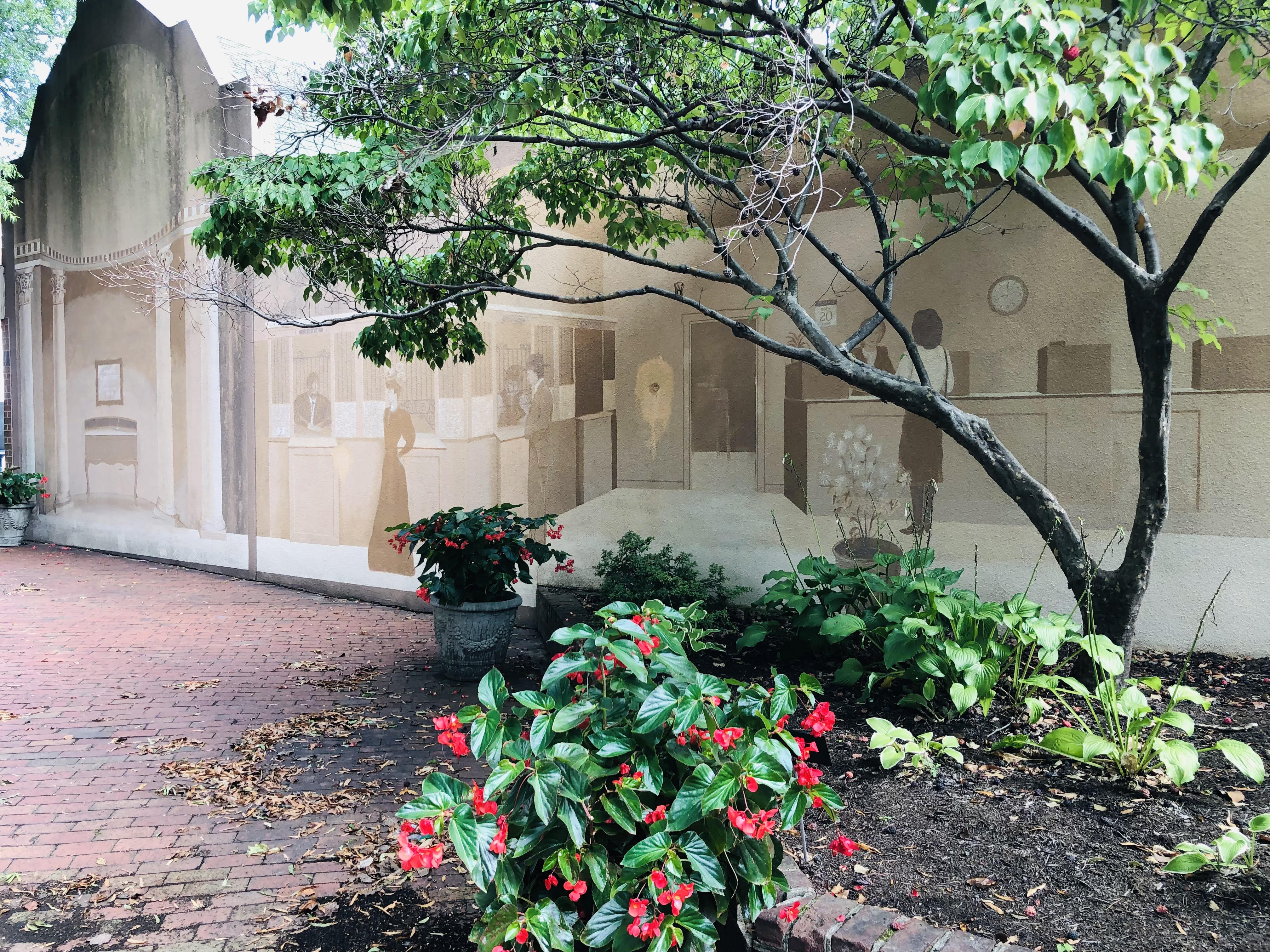 The time was nearing for my scheduled appointment to meet with local officials so Charlotte and I circled back to the heart of downtown to head over to town hall. But, along the way, I stumbled upon another respite area, called Taylor Park. Lovingly landscaped, the park features a fountain, benches and a raised stage area for events, such as special musical performances. The center fountain was gifted by the Dolley Madison Garden Club and sculpted by Gordonsville-based Raindrops in Virginia. Next to the park, a soft-toned mural on the side of Atlantic Union Bank depicts a banking scene reminiscent of the early 1900’s. Yet again, the town offers residents and visitors alike a beautiful space to relax!