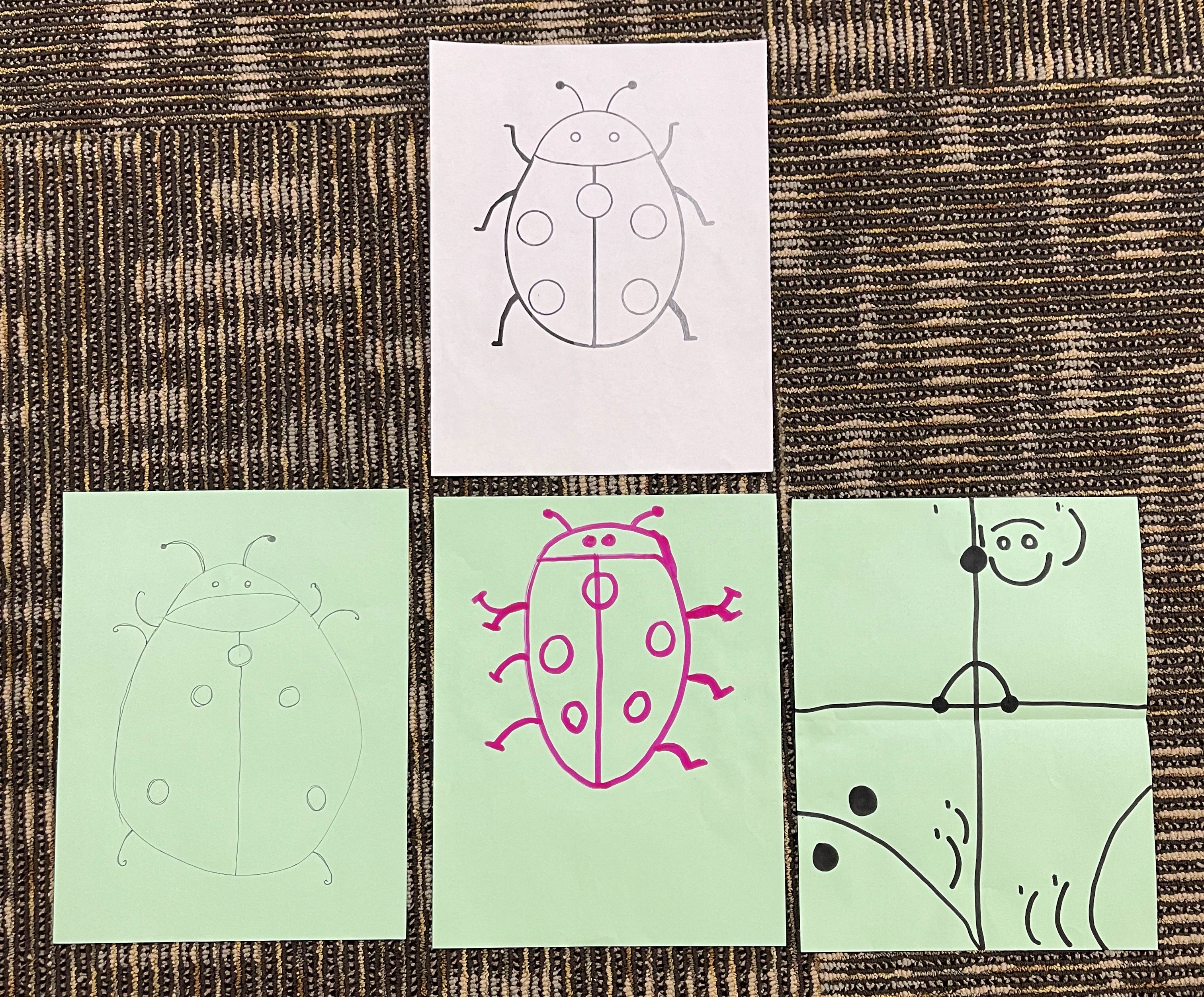 Back to back, we had fifteen minutes on the clock to direct our partner in drawing a robot. The image below shows the reference image on top, and then the three green sheets are what Team 1, 2, and 3 created based on directions that were given to them.