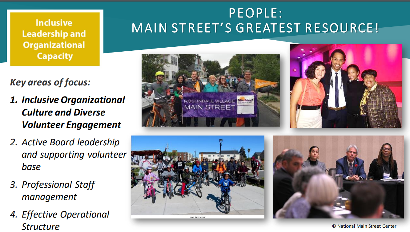 Inclusive Leadership and Organizational Capacity highlights the value we place on PEOPLE as Main Street’s greatest resource and our belief that everyone in the community has a place in Main Street. If you missed the webinar or are curious to hear the rest of the story, click here to watch the recording!