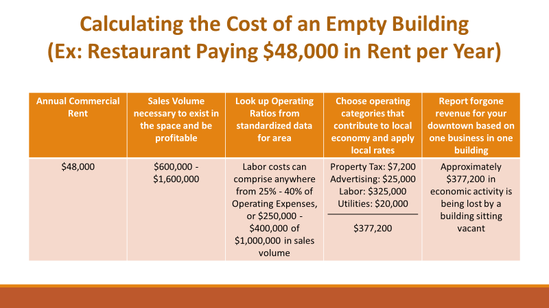 In 2019, Virginia Main Street (VMS) published The Cost of an Empty Building: Calculating Opportunities for Downtown on the VMS Blog to highlight what expert Donovan Rypkema of PlaceEconomics, a private sector real estate and economic development-consulting firm, had to say on the subject during a national Community Transformation Workshop hosted by Main Street America. He emphasized that calculating the impact of a vacant building is possible by simply analyzing the rent a building owner intends to charge. It can tell us many things, such as: