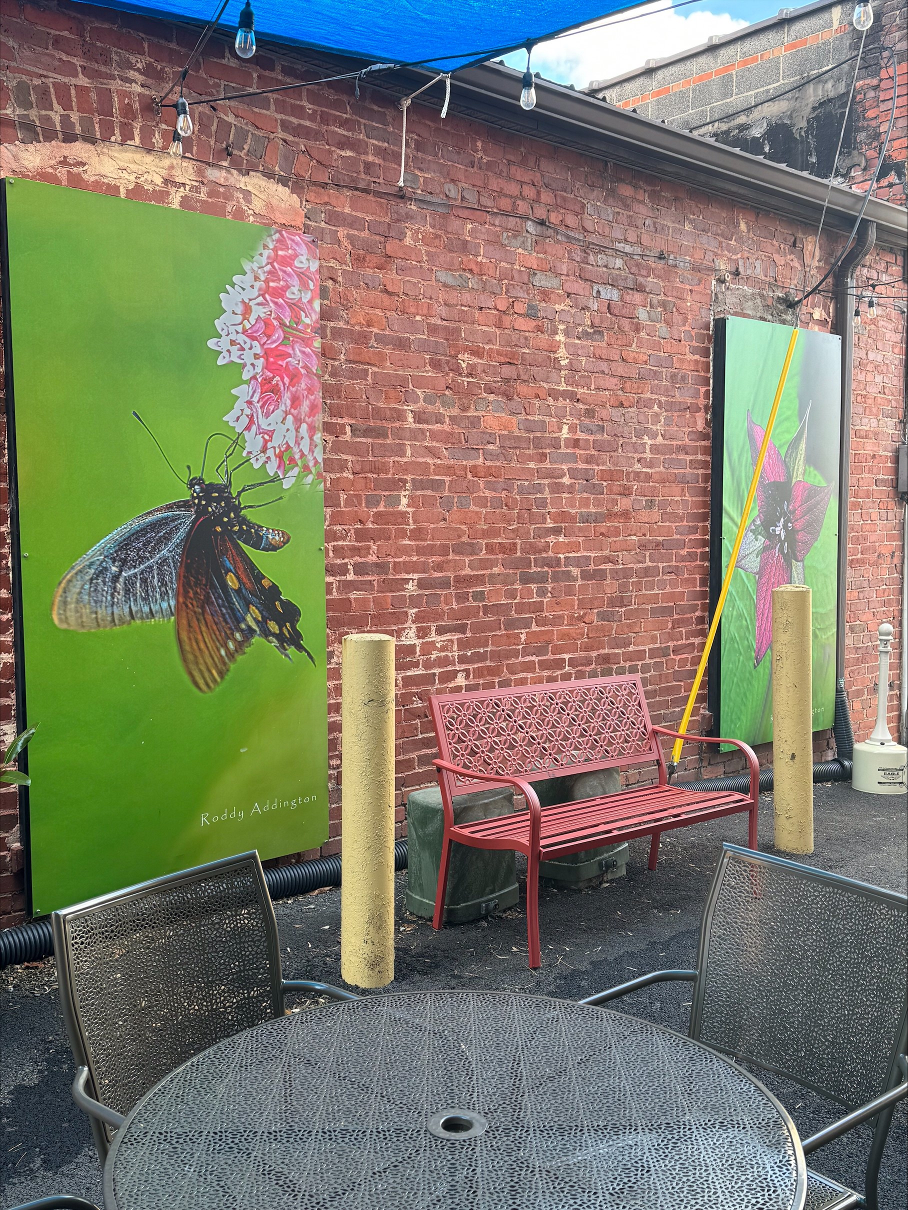 St. Paul continues to punch above its weight in downtown revitalization! With support from a $10,000 Virginia Main Street (VMS) Downtown Investment Grant (DIG), the community recently completed an alleyway activation project, creating a pocket-sized outdoor eating space between two restaurants that hosts both permanent and temporary art exhibits. One temporary exhibition space is truly pint-sized. The Small Art Gallery appears similar to a free little library in scale but with rotating exhibits of miniatures produced by local artists. Another temporary exhibit includes full-sized removable artworks placed on the walls of the Western Front Hotel. On permanent exhibit are two murals painted on the other side of the alleyway on the walls of Giovanni’s Pizza. These murals include a treasured spontaneous graffiti artwork that appeared in 2020 and artworks commissioned in 2022 depicting native plants. St. Paul is exploring adding a ground mural to the Art Alley in 2024.