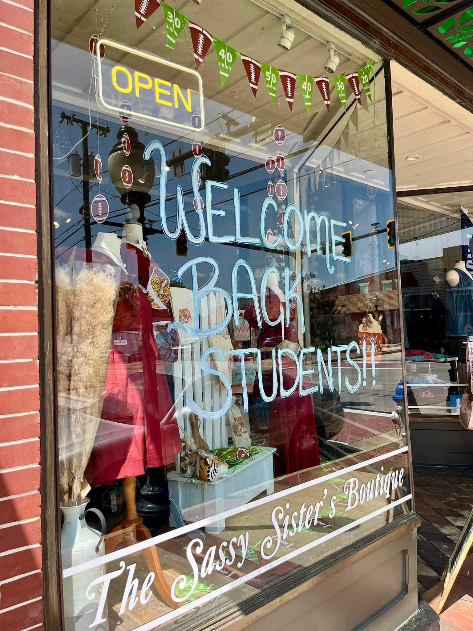 To further elevate the excitement during the Welcome Back Week event, FDP hosted a window decor contest. The organization’s Design Committee judged participating storefronts in downtown Farmville that reflected the community’s pride in being a two-college town. After careful consideration, FDP awarded first place to Sassy Sisters Boutique for their outstanding display. See photos below!