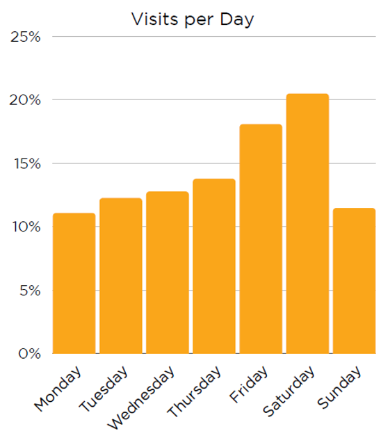 During a typical day in Virginia Main Streets, visits slowly increase until lunchtime, dip in the afternoon, and peak at dinnertime before tapering off in the evening. Visits peak at 6 pm, when 7.7% of hourly visits occur. About 15% of visits occur between 6pm and 8 pm. Lunchtime is the second busiest time of the day, with 14% of hourly visits occurring between Noon and 2 pm. Throughout the week, visits to Virginia Main Streets slowly grow as the weekend approaches. The busiest days are Saturdays and Fridays, capturing21% and 18% of daily visits, respectively. The quietest days for visits are Mondays (11%) and Sundays (12%).