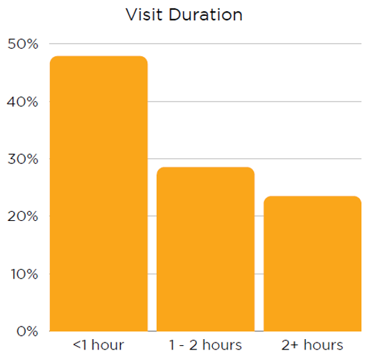 More than 17% of all 2024 visits to Virginia Main Streets lasted 2.5hours or more, while 19% of visits were quick stops, lasting between15 and 29 minutes. Further, about half (48%) of all visits lasted less than one hour while 29% lasted between one and two hours. Overall, visitors spent a lot of time in Main Street districts.