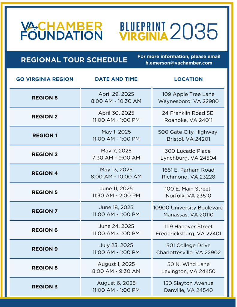 Second, the Chamber is hosting a series of discussions as a part of a regional tour schedule that will take place from April through August of 2025 and be held in each of the Go Virginia regions around the state. So pick your date and location, and join community and economic developers for this important conversation! Register for the regional tours and other Chamber events here >> VA Chamber Events <<.