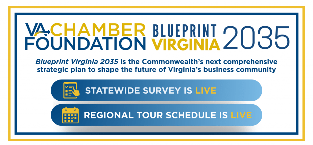 Throughout 2025, the Virginia Chamber of Commerce will be engaging in a campaign of wide reaching public and stakeholder outreach as they complete a comprehensive plan designed to keep Virginia as the state of choice for economic development. Blueprint Virginia 2035 seeks your input in multiple ways.