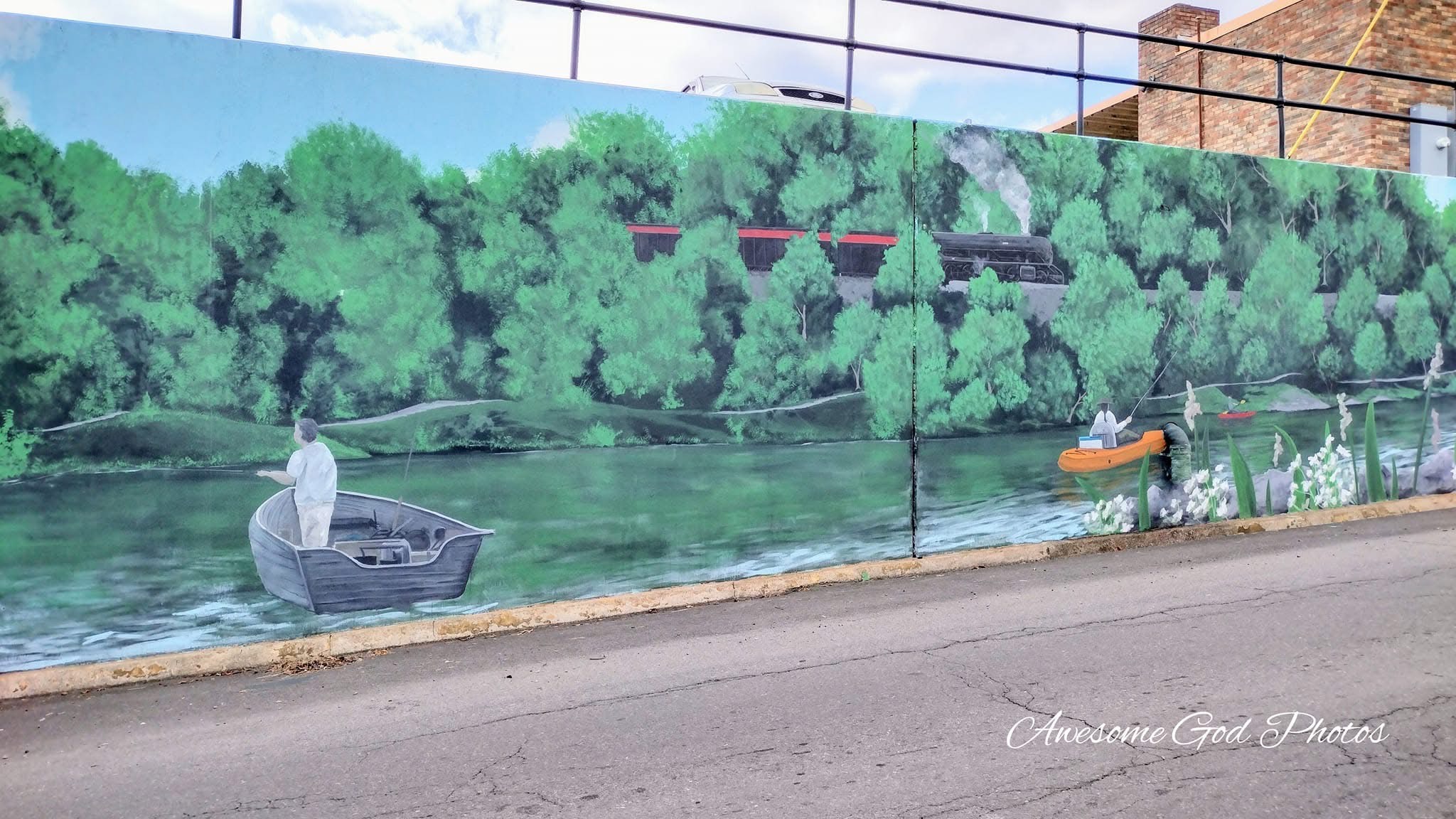 The project created a large-scale mural installed on the retaining walls beside the railroad trestle that runs adjacent to the downtown district. Designed to highlight the community’s natural and cultural heritage, the mural vividly depicts the Clinch River, one of the most biodiverse river systems in North America, and it is surrounded by native trees, wildflowers, and local wildlife. In addition to celebrating the area’s ecological richness, the artwork also incorporates elements of St. Paul’s history, weaving in stories of the town’s past and its connection to the land and rail.