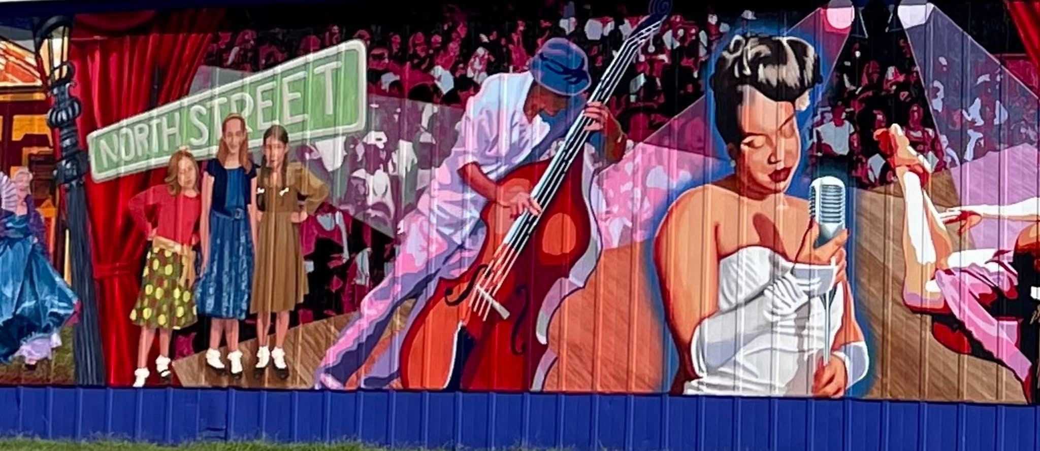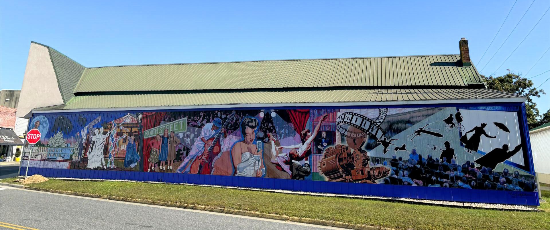 One of the most visible achievements was OMS’ third mural project at The North Street Playhouse, a montage of Onancock’s legacy of theater and performing arts. The bold, colorful artwork, paired with protective landscaping, lighting, and directional signage, became an instant landmark. The mural’s unveiling drew coverage from the Eastern Shore Post and even a feature on Hampton Roads’ WTKR TV, putting Onancock’s creativity in the regional spotlight.
