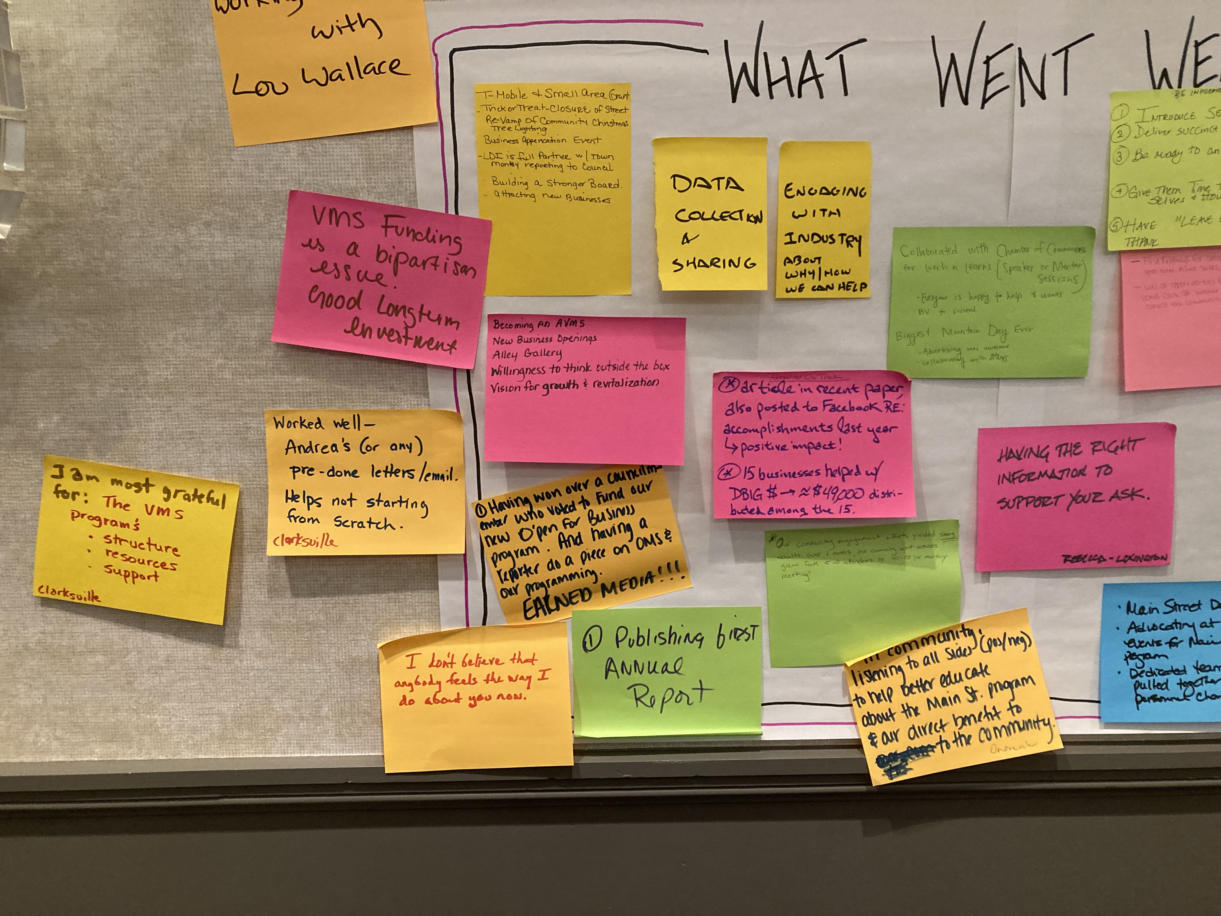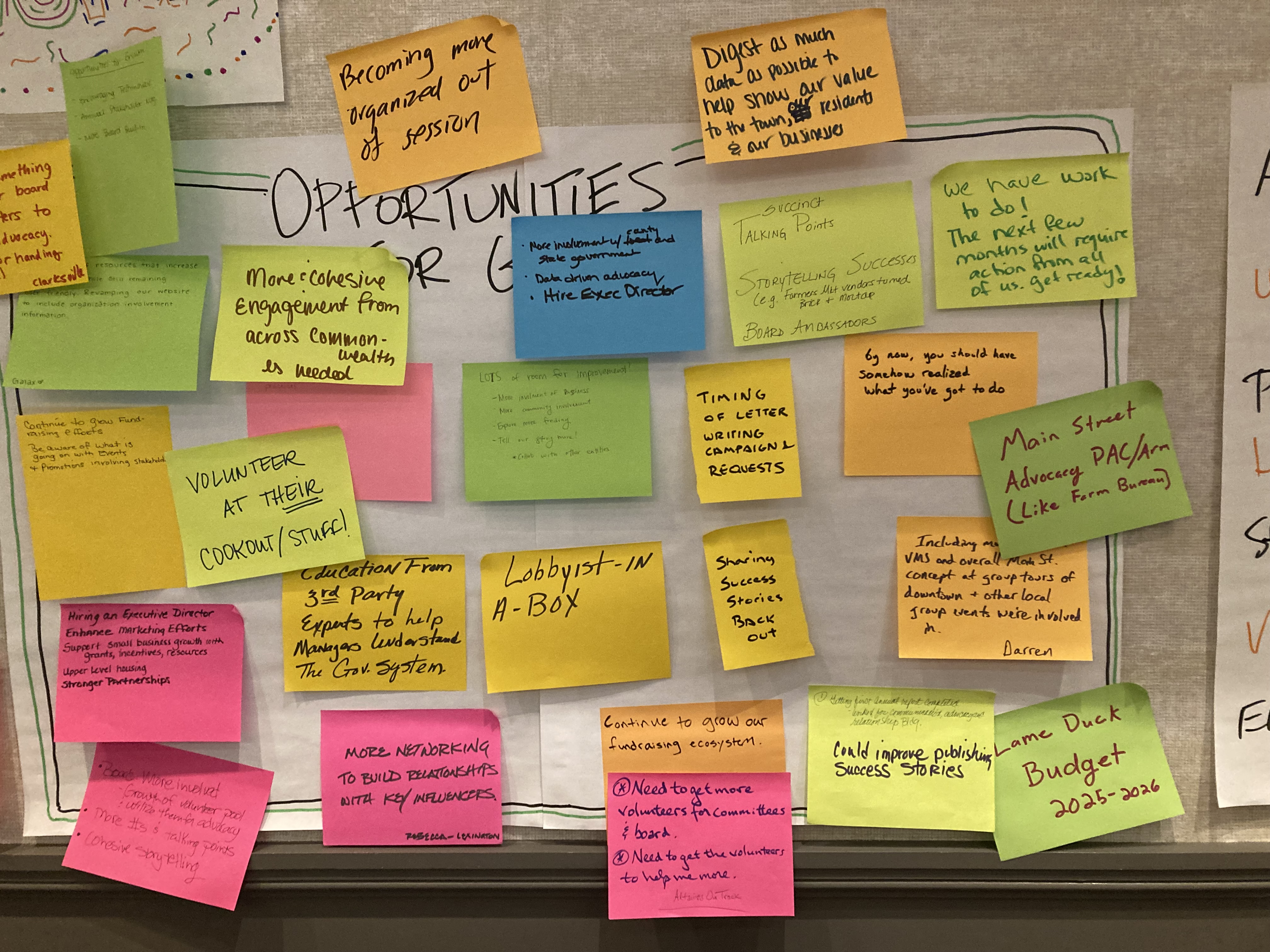 At the 2025 Advancing Virginia Main Street (VMS) Executive Director Retreat, local program directors engaged in the Wonderwall—a self-directed facilitation exercise designed to spark reflection on public communication efforts. Rooted in Appreciative Inquiry, the activity invited participants to first celebrate “what went well” before considering “opportunities for growth.” The goal: to help executive directors sharpen their storytelling, strengthen relationships, and ensure the long-term sustainability of their downtown programs.