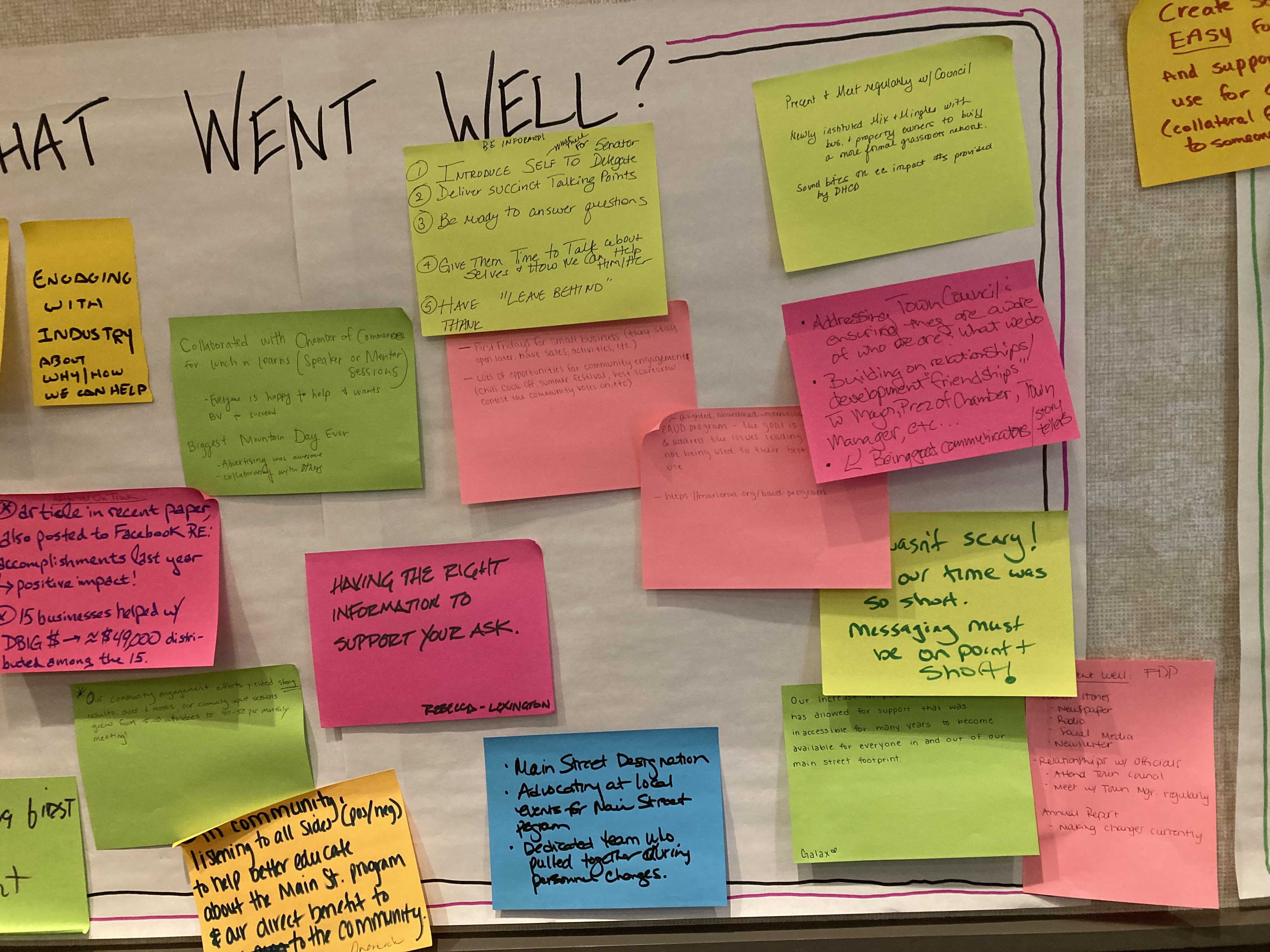 - Build collective messaging – Coordinate with other local Main Street programs to speak with one cohesive voice and expand relationships with statewide leaders (Lexington).