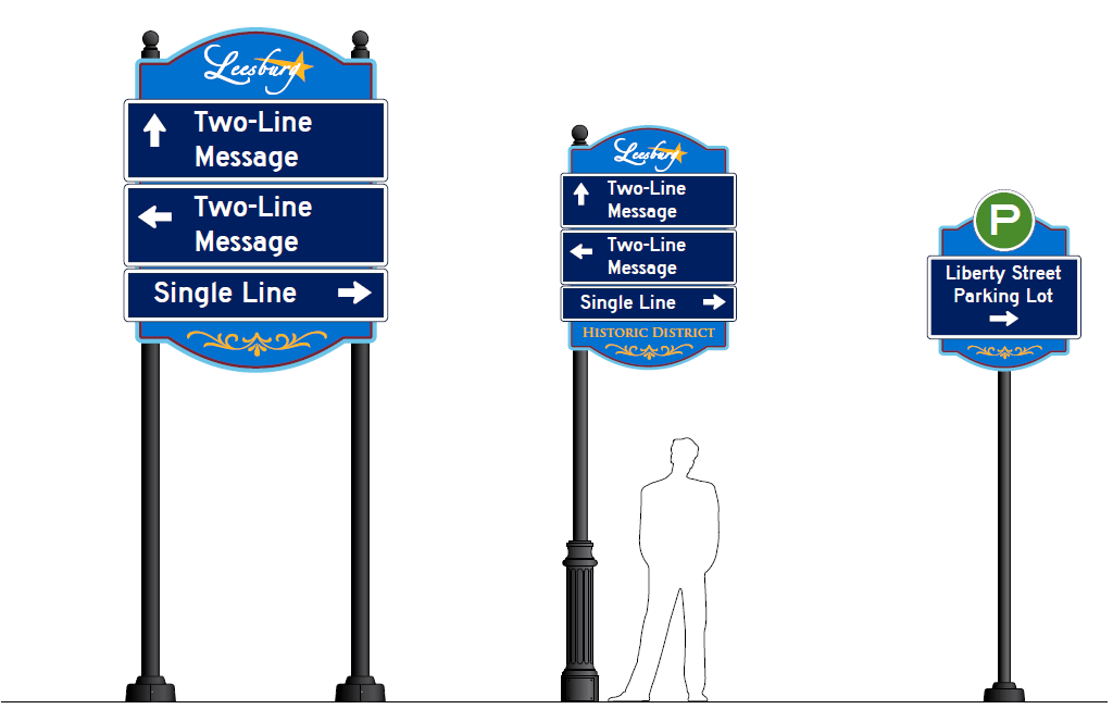 To complete the redesign and modernization of its existing wayfinding system, the Town re-hired the system’s original designer, Frazier Associates. The comprehensive project’s goals included improved vehicular and pedestrian navigation, increased economic activity, and incorporation of Leesburg’s updated branding. Existing signage was assessed in person, and new signage was determined through stakeholder engagement, as well as analysis of current traffic patterns and data. Multiple focus group sessions were held to determine which downtown destinations to highlight and how best to cater to the needs of diverse users. Following extensive data collection and feedback, schematic designs were developed based on Leesburg’s updated branding.