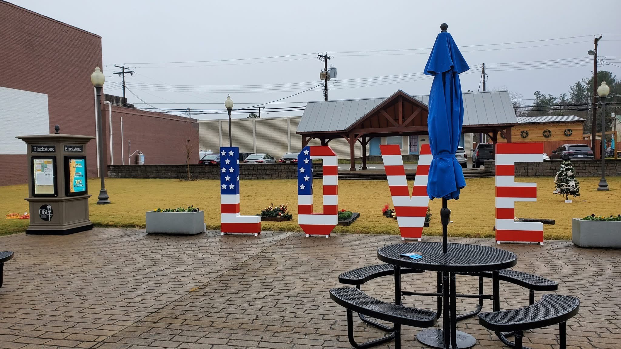 A notable feature of the project is the new custom metal LOVE sign, fabricated by C. Bennett’s Industrial Maintenance and Welding LLC. This highly visible and locally crafted element not only adds a distinctive sense of place to the square but also directly supports one of the local Main Street organization’s key Transformation Strategies—Military Connections. The LOVE sign helps strengthen the visual and symbolic connection between downtown Blackstone, Fort Pickett, and the Foreign Affairs Security Training Center, celebrating the community’s strong military presence, heritage, and sense of patriotism while reinforcing downtown as a welcoming destination for service members, families, and visitors alike.
